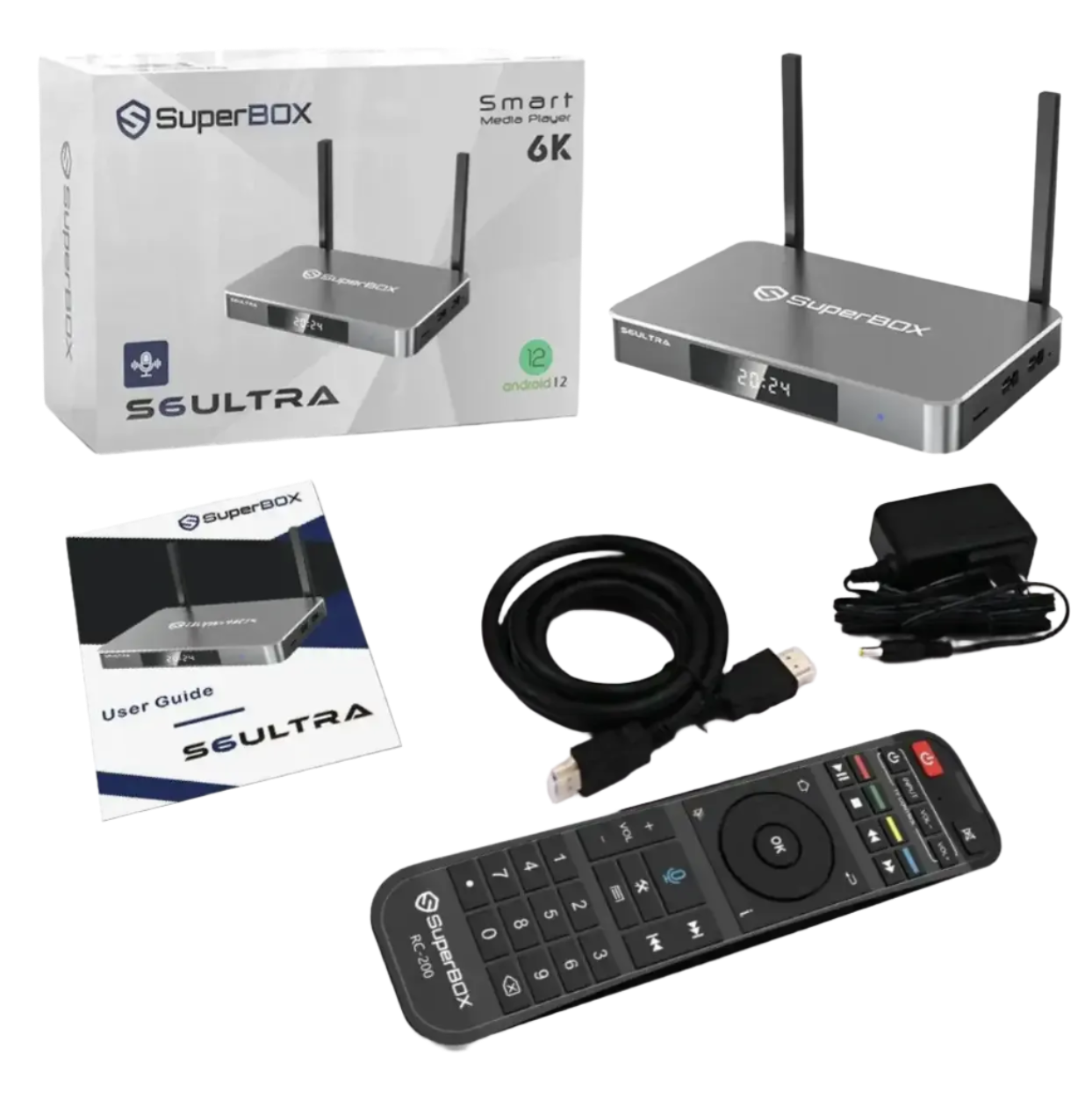 SuperBox S6 Max: 4K HD, voice assistant, 1-year warranty, plug & play, updateable, dual-band Wi-Fi & Ethernet, remote & accessories included, legal Android 12 streaming device.